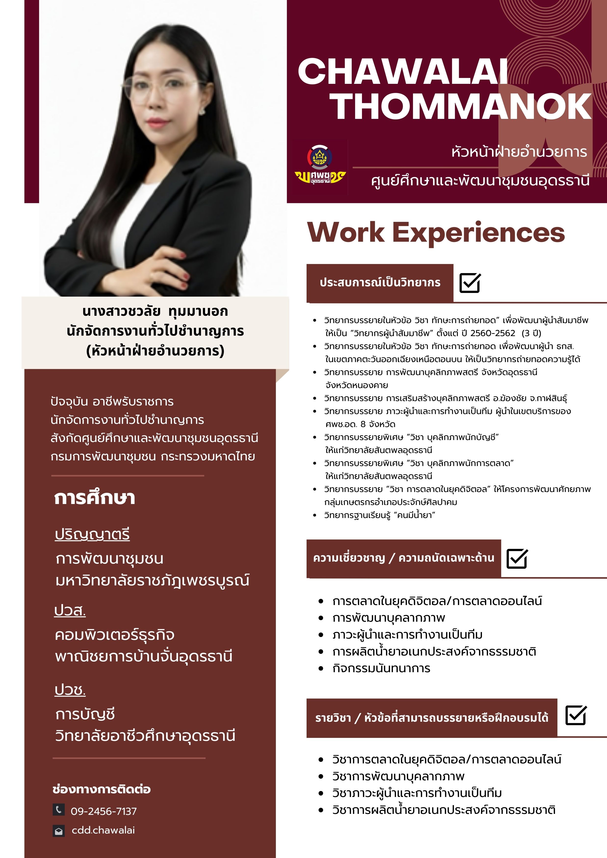 นางสาวชวลัย ทุมมานอก นักจัดการงานทั่วไปชำนาญการ หัวหน้าฝ่ายอำนวยการ