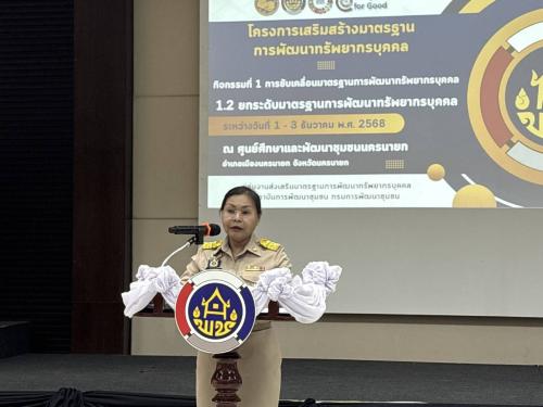 กิจกรรมดังกล่าว สถาบันการพัฒนาชุมชน กรมการพัฒนาชุมชน ดำเนินโครงการฯ เพื่อสร้างความรู้ความเข้าใจในบทบาทนักทรัพยากรบุคคล และแนวทางการพัฒนาการรักษามาตรฐานการพัฒนาทรัพยากรบุคคล ทั้ง 3 มาตรฐาน ได้แก่ มาตรฐานการฝึกอบรม (TOP Training) มาตรฐานนักทรัพยากรบุคคล (TALENT Trainer) และมาตรฐานการให้บริการ (Better Touch Point) ระหว่างวันที่ 1 - 3 ธันวาคม 2568 ที่ศูนย์ศึกษาและพัฒนาชุมชนนครนายก